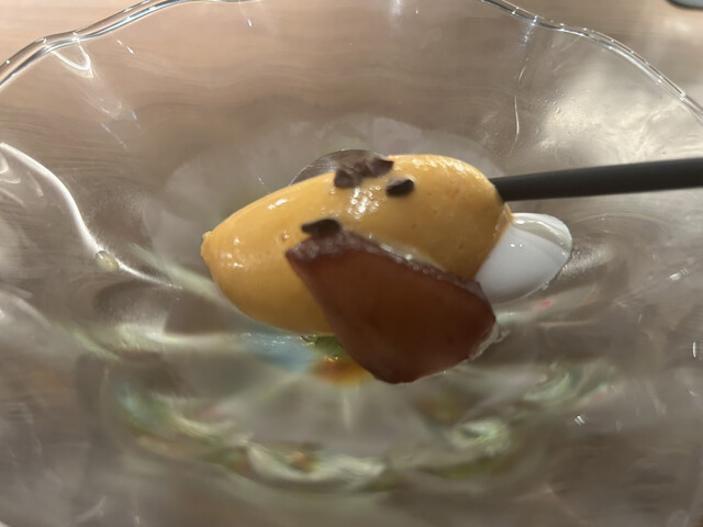 一品目のアスパラガスの葛餡から日本料理レベル、二品目のハーブサラダの卵黄ソースも見た目も素晴らしく器毎食べれる豪快なサラダ