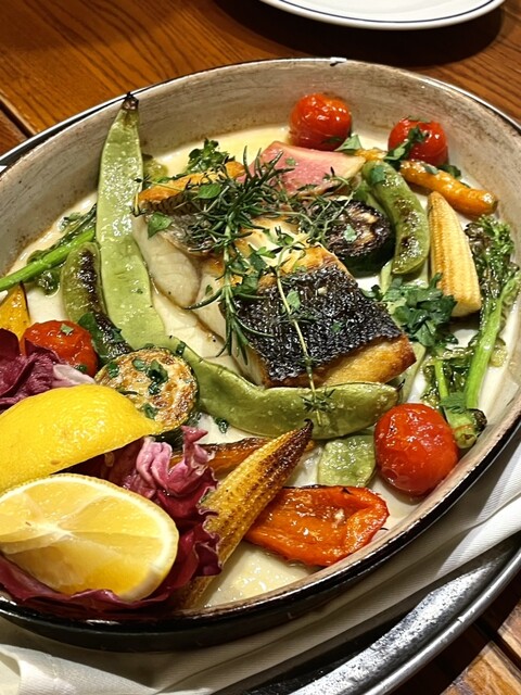 あと旬野菜と魚の煮込みも頼んだけどまたこれが魚出汁を味わえて最高…白ワインが止まりません