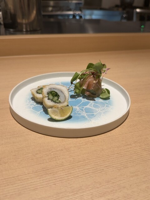 ハモの博多ネギ巻き揚げ、長崎キンメダイのウロコ焼き、