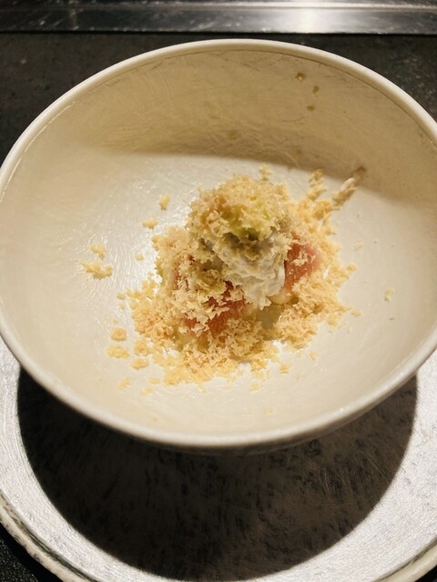 ジューシーなマスカットの爽やかさと、白和えのまろやかさに、フォアグラの濃厚なコクが加わり、甘さと旨みが重なる斬新な組み合わせ❗️