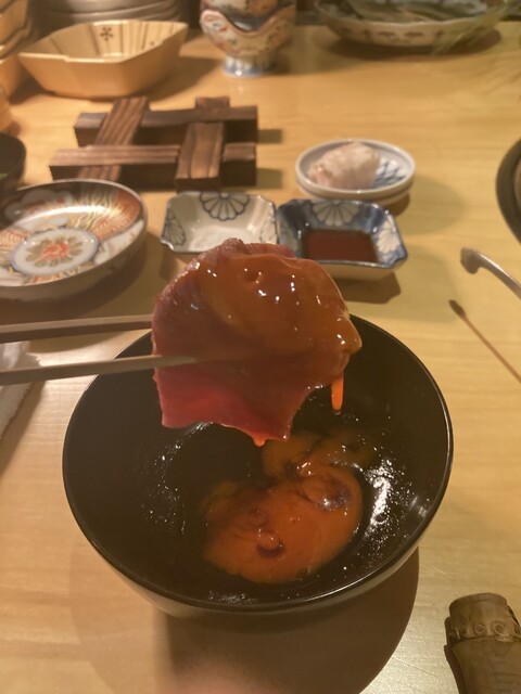 和牛の甘みを活かしたユッケ仕立てを、菓子椀で供する遊び心ある名物!濃厚ながらも上品な余韻!美味❗️