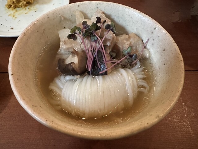 利尻昆布と静岡県産の煎茶を時間をかけて抽出していて、薄っすらと緑がかった出汁に、じゅんさいがのっていて、梅干し、薬味の茗荷、白髪葱を添えて頂きます。