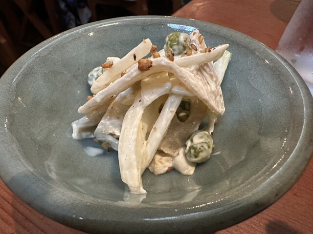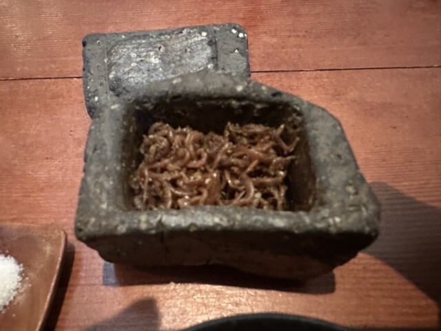 端っこの席に案内して頂き、日本酒では無く焼酎用のメニューを受け取って奄美のお湯割り、焙煎、粗挽きは既に売り切れだったので、蕎麦前の前に玄挽き蕎麦を注文。