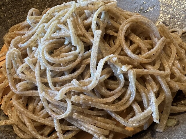 最後の〆に平打ち。これも結構粗めで、平打ちならではの舌触りが良く、香り甘み共に強めで喉越しも良し。