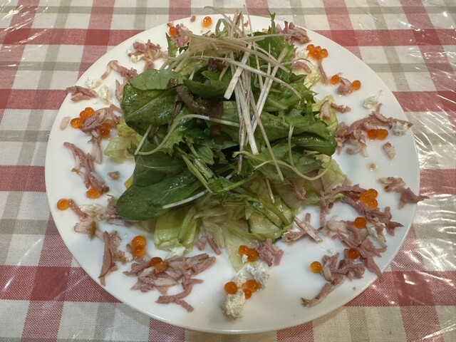 玉ねぎの旨みが凝縮されたオニオンスープ美味しいです。写真ではわかりづらいですが、サラダのボリュームが結構あり食べ応え十分。皿の淵に散りばめられた、イクラと鴨肉の塩味の具合が良いですね。