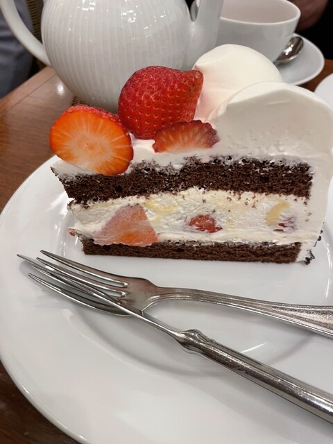 私はストロベリーチョコレートを、友人はストロベリーケーキというお互いオーソドックなメニューになりました☺️。美味しすぎてもう他のケーキに行けなさそうです。