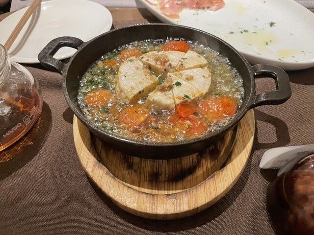 牡蠣とレモンのアヒージョ、チーズとトマトのアヒージョ、ガトーショコラ、生クリームとフルーツがたくさん乗っています。