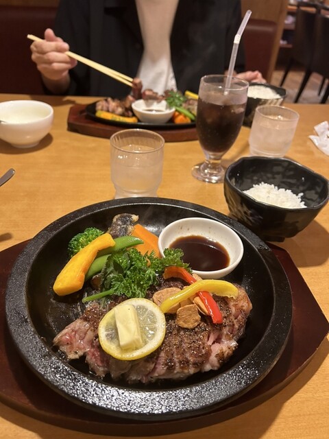 次男のサーロインは、鉄板から、はみ出そうな大きさ!それぞれ交換して、食べ比べました。サーロインはひと口噛むとさっぱりと美味しい油が口に広がります。これなら、私も食べれます。