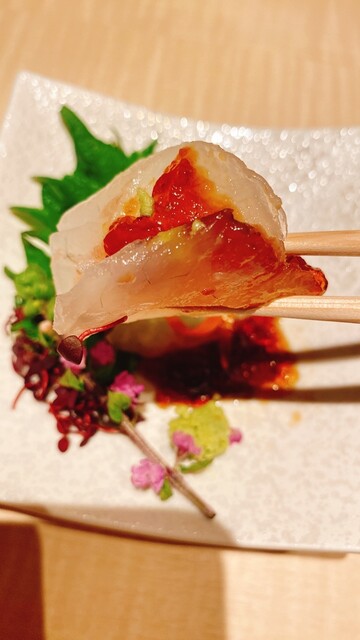 天然のヒラメが新鮮でプルプルの醤油のジュレが綺麗に盛り付けてあり、見た目もお味も美味しい一品