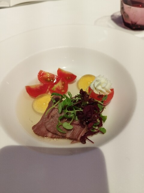 大地の恵み 松坂牛のローストビーフとトマトのジュレソース ペアリングのワインはオレンジワイン ノンアルコールはオレンジとハーブウォーター 飲み物が美味しすぎ