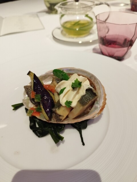 低温調理とフリットの2種の鮑を味わう。ソースと併せて味わいの変化を楽しむ。貝殻の下のわかめも美味しくいただく。