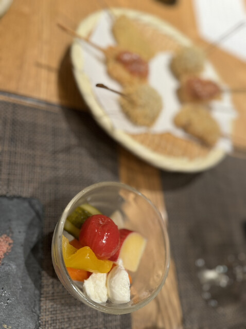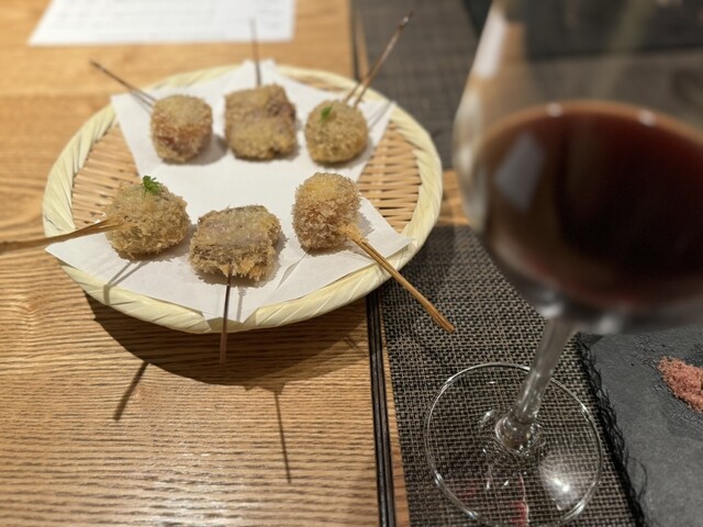 串揚げのコースのみとなっています。接客は丁寧ですし、お店もキレイです。前菜から見た目も美しくて美味しかったです。それぞれに合うワインをグラスでいただけるのも嬉しいです。季節によってメニューが変わると思うので違う季節にも伺いたいと思いました。