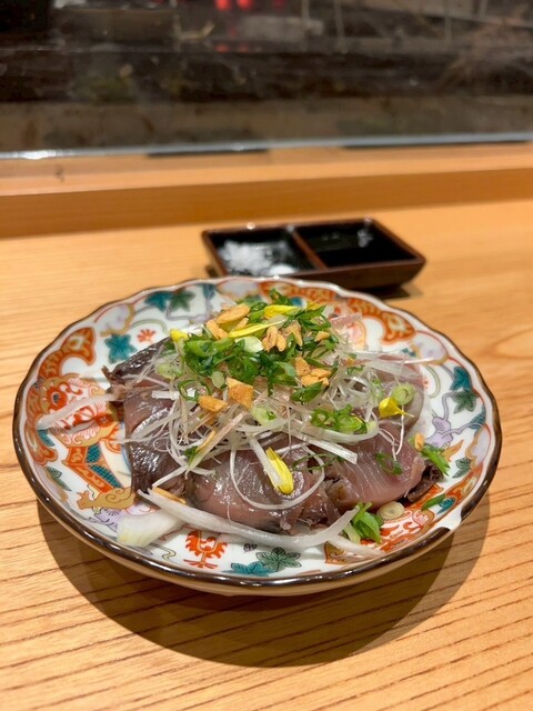 岩塩で食べるのが個人的おすすめ。添えられた玉ねぎもシャキシャキで辛味控えめ、カツオの力強い味をうまく支えてくれる。