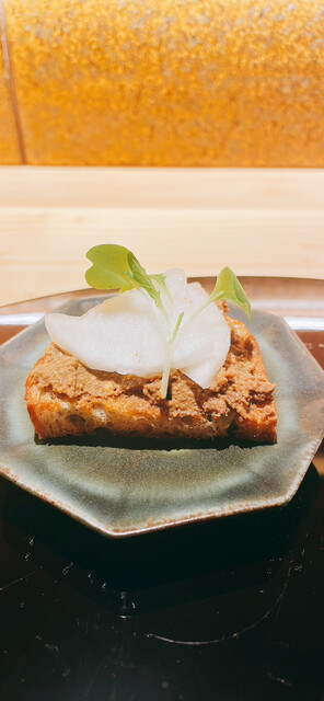レバーパテの上に大根の漬物が乗った一品も絶品。お口直しのサラダには柿やシャインマスカットが入っていて季節感と爽やかさを楽しめました。