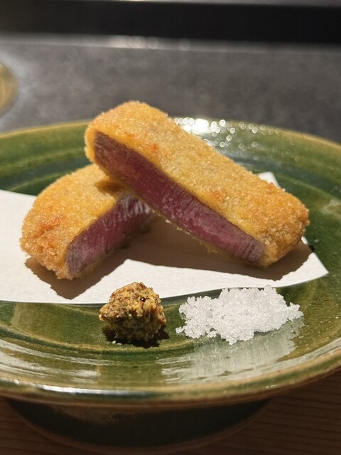 揚げ物の流れで登場する「近江牛の牛フィレカツ」は、サクサクとした細かな衣に包まれた柔らかいフィレ肉が絶品。