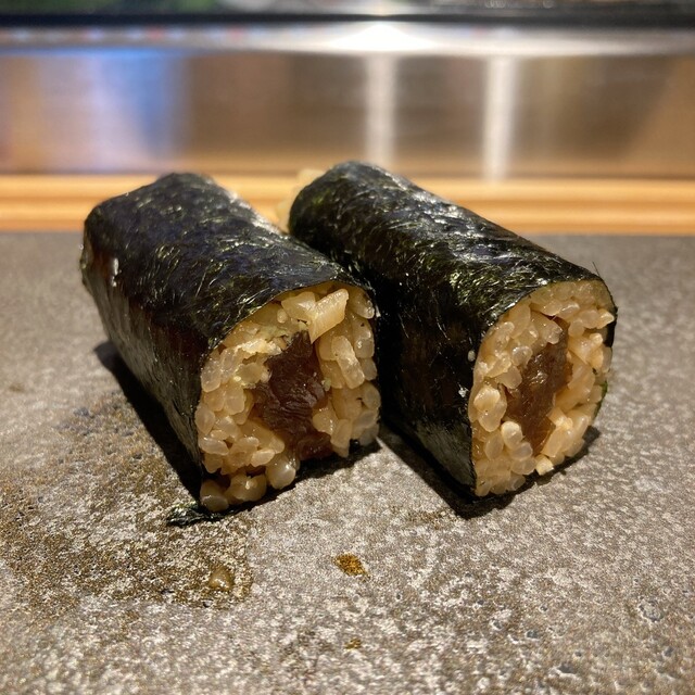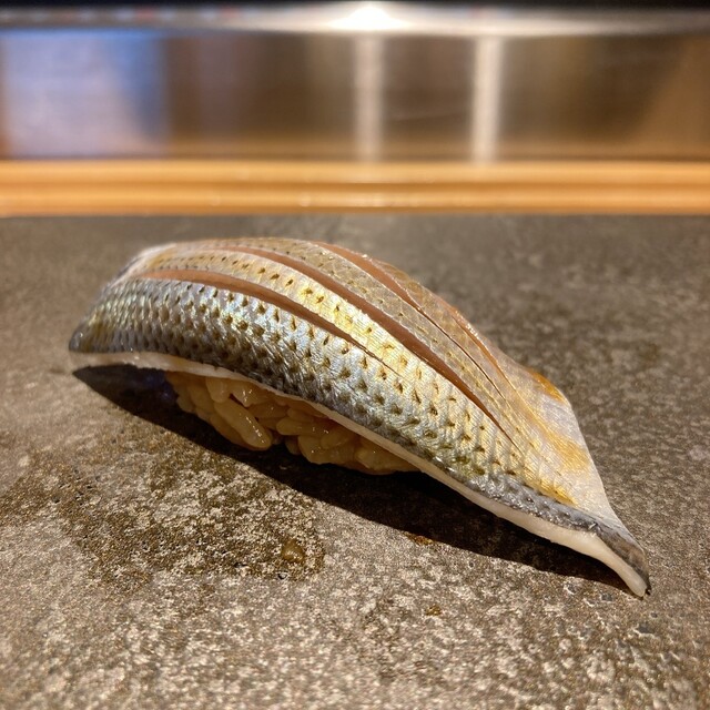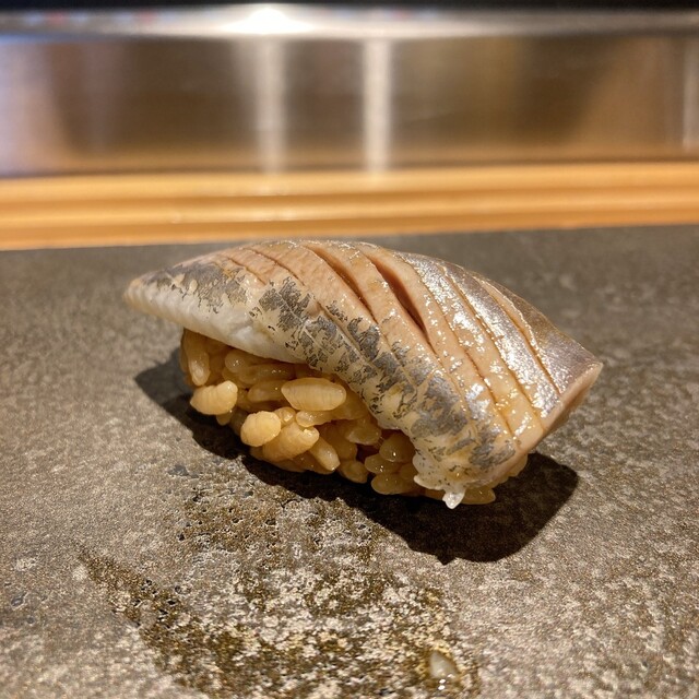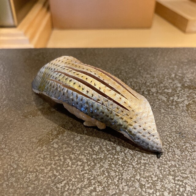 ひらめ昆布シメ、ホタテ、鯵、蒸しエビ、イワシ、中トロ、ブリ、穴子、鉄砲巻き、玉子