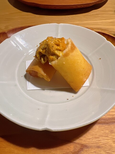 春巻も中のクリーミーなカリフラワーの甘みと乗せられた紫雲丹の甘みの組み合わせが秀逸です。