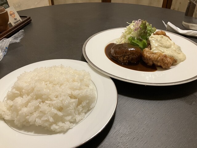 ハンバーグと鶏もものチキン南蛮のセット1,470円を注文、待つこと60分で入店出来ました。入店後間も無く提供され実食、自家製タルタルソースから極ウマで鶏もも肉の旨み、タレも美味しく今までに食べたことのない美味しさのチキン南蛮です、ハンバーグも美味しくあっという間に完食となりました。