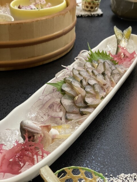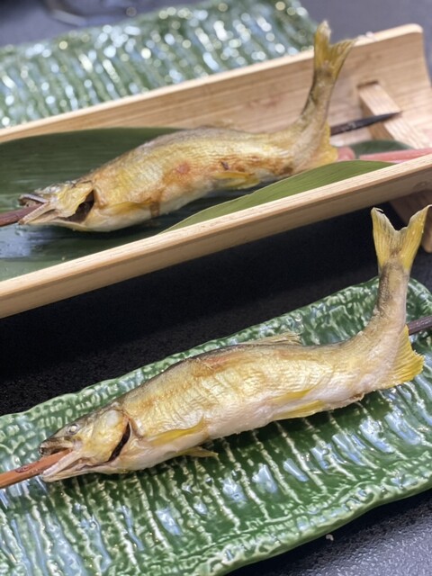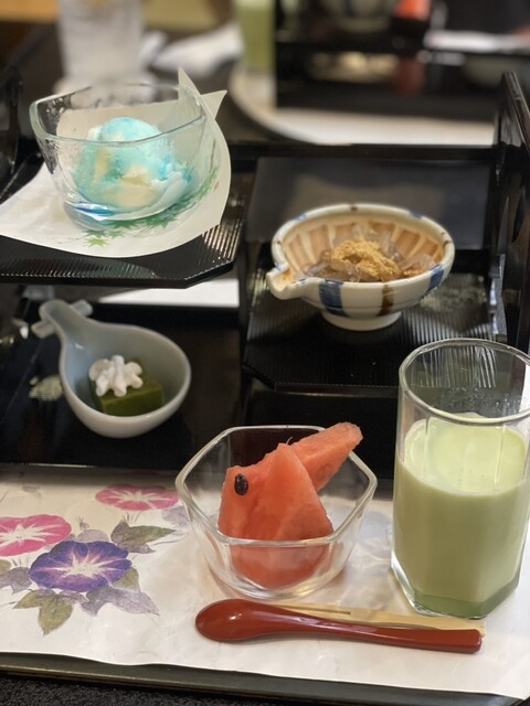 料理長の優れたセンスが光る夏メニュー。6月下旬には鮎も解禁され、「夏の鮎祭り」と称して通常メニューには鮎の塩焼き、別注では珍しい鮎の刺身『鮎の背越し』を堪能しました。贅沢海山懐石のメインは日本海産の大ぶり岩ガキ。そして、フカヒレたっぷりの茶碗蒸し、茄子の揚げ出し海老あんかけ、きゅうりの一本漬けといった料理が並びます。宿の入り口にある滝つぼで冷やしたスイカときゅうりバーも夕食に出されて、夏の涼を感じました。