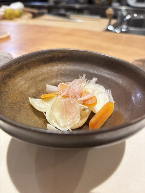 お次はゆりねとカラスミにベーコンを鰹節のように削ったものを添えたお料理です。