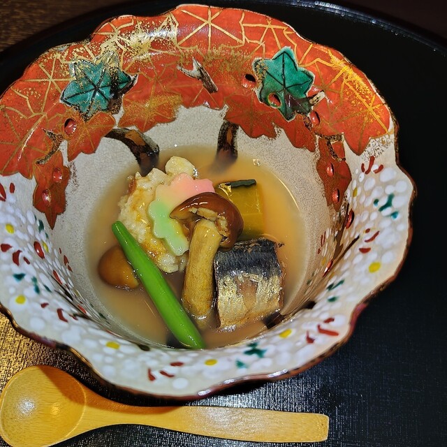 イワシ、ジャンボナメコ、ジャガイモとミンチ肉、カボチャの炊合せ、餡との味が美味しかったです