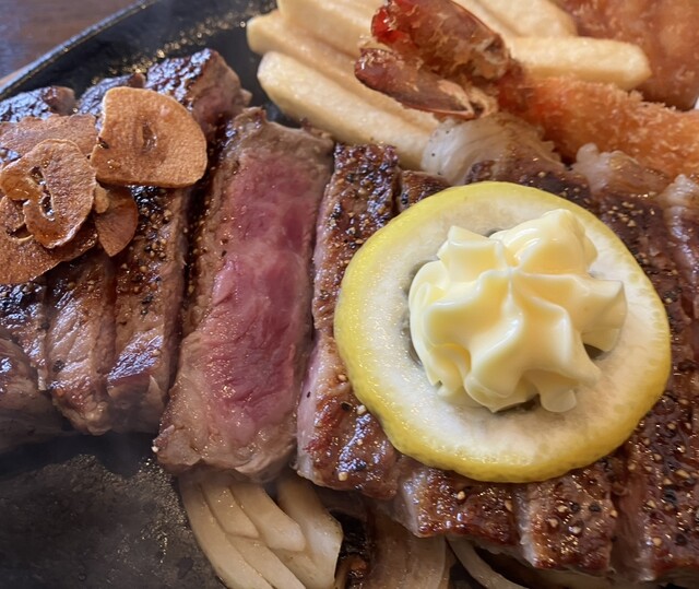 ・サーロインステーキ350gのセットにエビフライを2本トッピング。