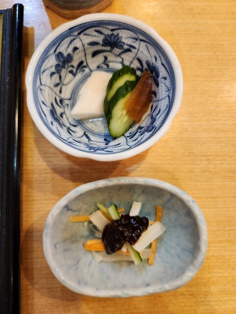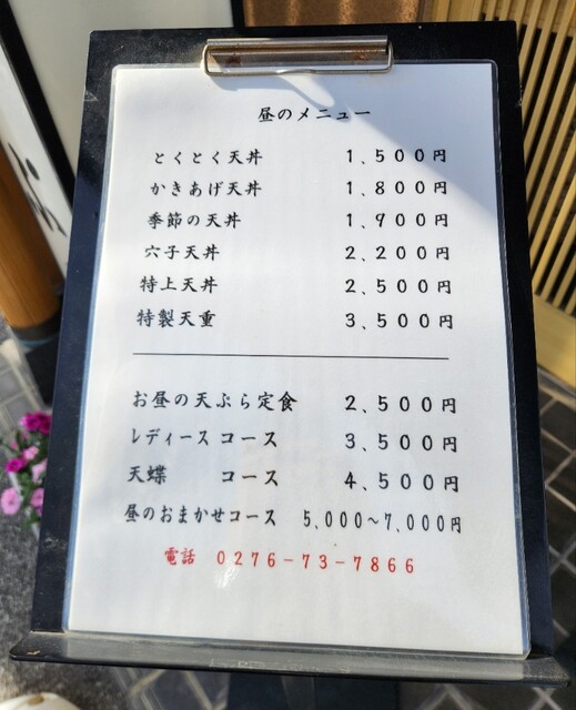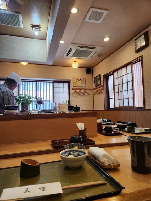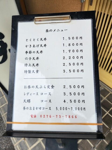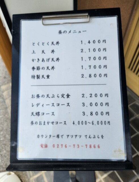 天丼が食べたくなると決まって行く、館林市の天蝶に行って来ました。11:30開店と同時に一番乗りで入店。いつものカウンター席に座りました。後から1組来店されました。メニューが変わりましたとお姉さんが。そうです。値上げになっていました。入口にあるメニュー看板を見てすぐ分かりました。このご時世しかたないですね。今日は100円上がったかきあげ天丼1,800円をお願いしました。大きいかきあげ一品と野菜が一品です。上の小鉢は奈良漬、キュウリ、山芋の漬け物。下の小鉢はふき味噌が付きます。しじみの味噌汁は身までしっかり頂きました。美味しかったです。