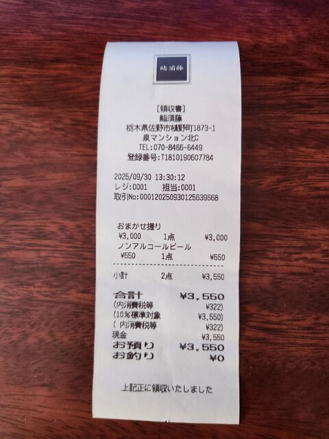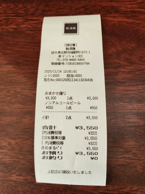 今日は久し振りに佐野市植野町の「鮨須藤」に行って来ました。11:30に1組様と入店。ここはカウンター席なので三番目に着席。今はおまかせ握り3,000円のランチのみと一択ですね。飲み物はノンアルコールビール550円をお願いしました。握り10貫を目の前で握ってくれます。10貫目のやさしい味の玉子を食べて満腹に他のお客様は追加の握りを頼んでいました。美味しい味噌汁を味わい、合わせて3,550円をお支払し店の外までお見送りをしていただき帰って来ました。鉄箸を温め焼き目を入れた帆立が美味しかったです。ごちそうさまでした。