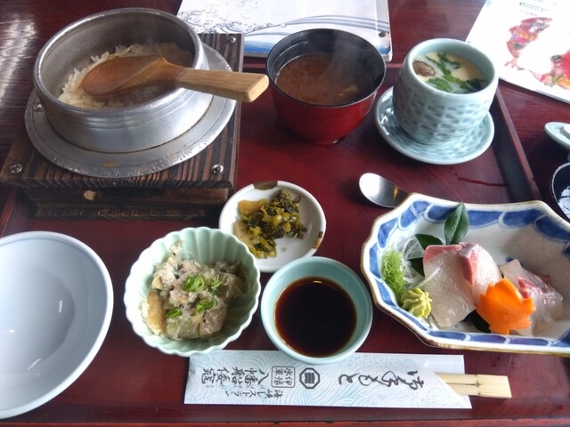 内容は鯛釜飯、ぶり?のアラ汁、茶碗蒸し、ぶりと鯛?の刺身、小鉢、漬物です。