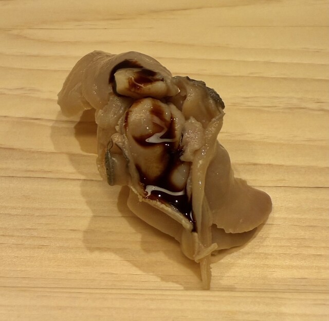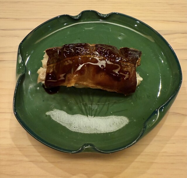 炙ったものをカウンターではなく私の手に載せていただくスタイル。お手を拝借みたいでいいですね!初めてこういう方法でお寿司を食べます。崩れやすいので直接 手に載せるのだそうです。新しいこと嬉しい。お味もとっても美味しかったです。