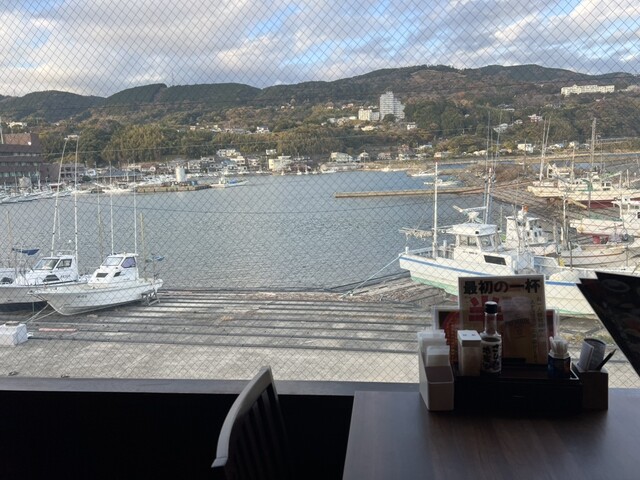 大きな窓ガラス一面に広がる稲取漁港の景色は圧巻。