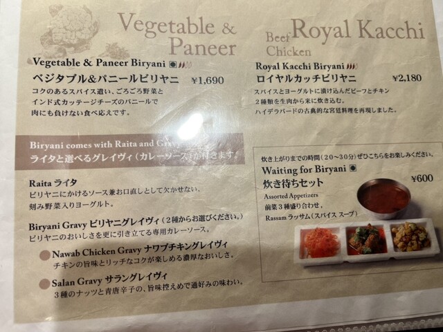 ロイヤルカッチビリヤニと鯖ビリヤニを注文しました。ライタとグレイヴィソースがつきますが、グレイヴィソースはナワブチキングレイヴィとサラングレイヴィの2種類から選べます。初心者にはよく分からないのでひとつずつ選択。