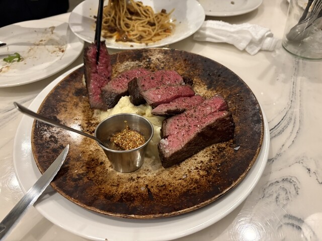 料理はパスタ、ピザ、肉料理など頂いて、どれも美味しかったですが、イチボのステーキが絶品!