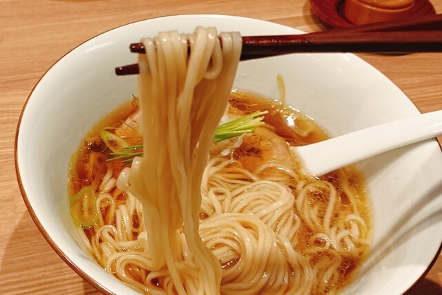 スープによく絡み、ツルツルして噛むとモチモチの食感!噛む歯ごたえもこれまでにない!