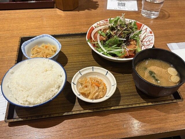 メインのチキン竜田は大きな鶏肉がドカンと4つ。黒ゴマと玉ねぎの黒酢だれが絡んでて、これがまたご飯が進む進む!サクッとした衣とジューシーな鶏肉のバランスが絶妙で、文句なしに美味しい。味噌汁も、よくある「しょっぱすぎて飲めない」タイプじゃなくて、出汁が効いてておかわりしたくなるくらい良かった。
