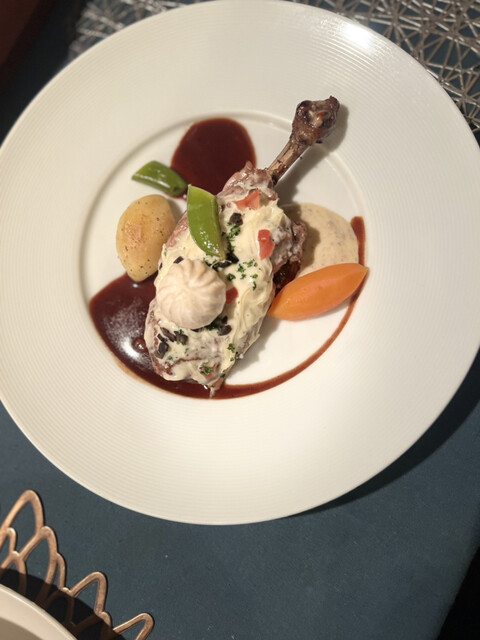 前菜プレート⇨ピザ風バケット⇨スープ⇨魚メイン