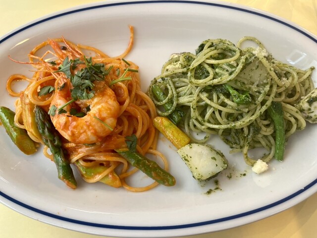天使海老とアスパラのトマトクリームソース➕カジキマグロのジェノベーゼ