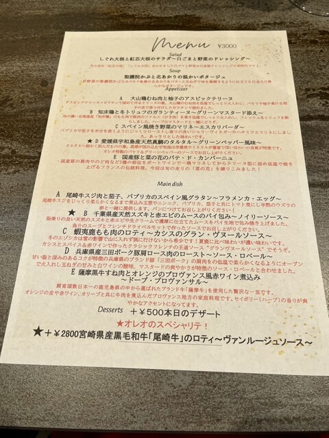 昨日のことを踏まえ、デザートはお腹の調子を見てからと思い、3000円のコースでお願いしました。