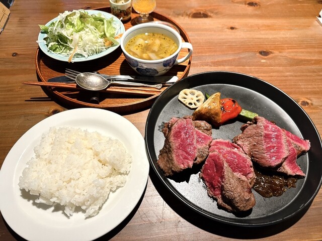 肉は3種類(右 ハネシタ、中 クラシタカブリ、左 クラシタ)どれも味や食感が異なり部位ごとの美味しさを存分に堪能。スープは具だくさんでサラダはドレッシングとの相性抜群。終始高級レストランでのランチ気分でした。