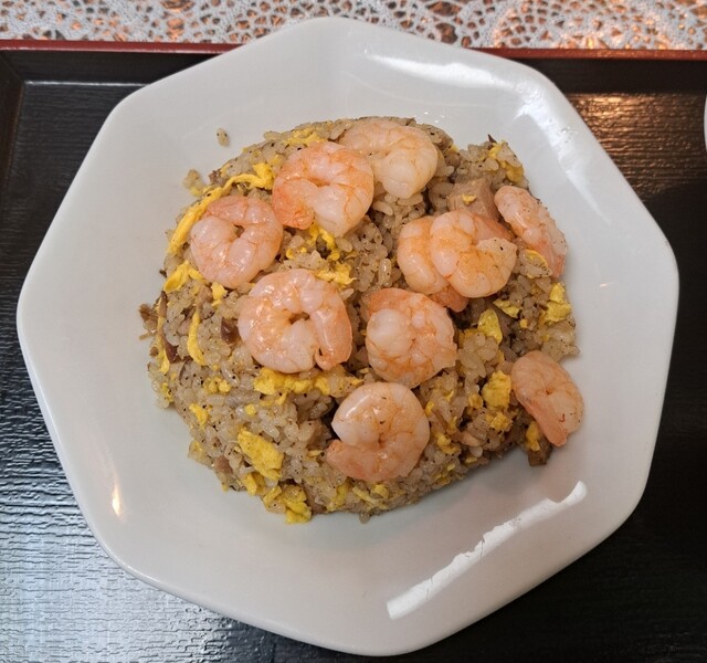 海老チャーハンは、海老とチャーシューがゴロゴロと沢山。塩と胡椒が濃いめの味が美味しい。