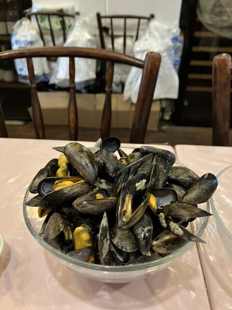 前菜は、海鮮類の盛り合わせ。新鮮な魚介類を冷製で仕立てています。かなりたっぷりといただけます。これだけでワインが吹き飛びます。アミューズとして、山盛りムール貝が付いてきました。