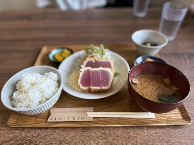 私のいただいたマグロのレアカツ定食。このマグロがしっかりとした肉厚で大分お腹いっぱいになります。下に敷かれたタルタルソースがまた良い仕事をしてくれます。ご飯とお味噌汁がおかわりできるのが嬉しいですね。