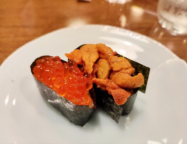 ウニの良いのが入ってるとのことで。でっかいウニにピカピカのイカを添えて。言葉は要らない美味しさ。