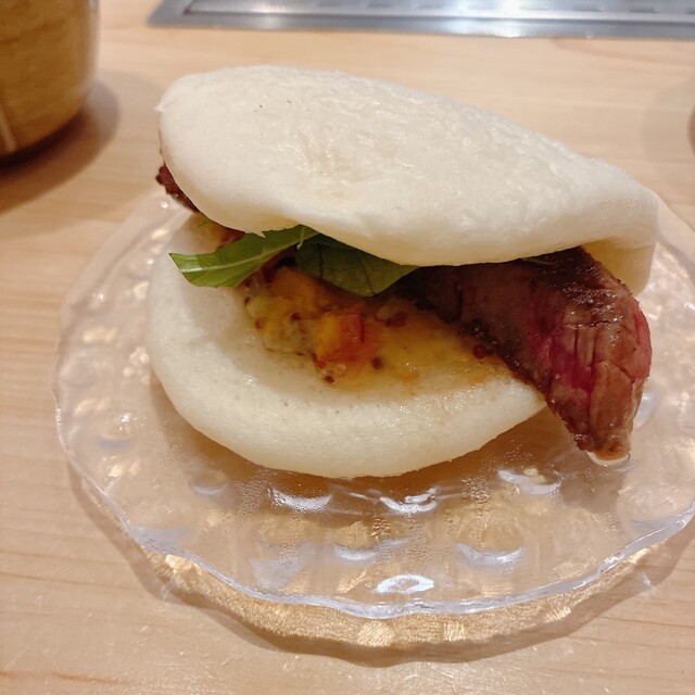 お店で蒸した少し甘みのある特製生地がとっても美味しくて、ジューシーなお肉とシャキシャキの紫玉ねぎマリネの融合が秀逸。