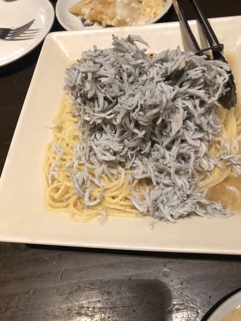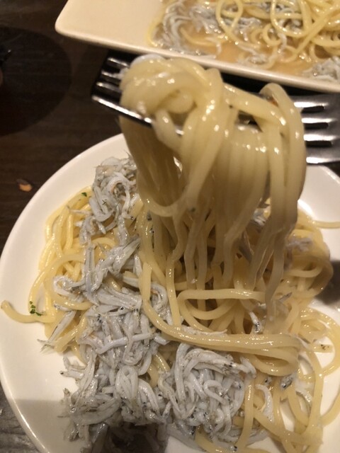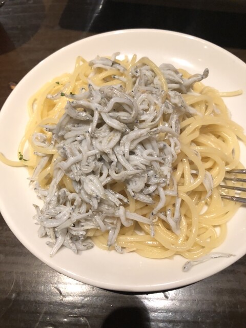 ペペロンチーノに食べる直前にしらすをこれでもかーって位に乗っけてくれます!!もう山盛り(≧▽≦)♡味もさっぱりだけどちゃんとペペロンチーノでとっても美味しいー♡