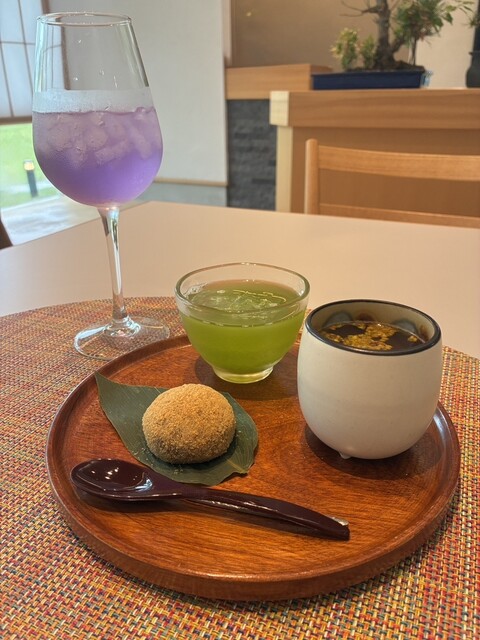 席には本日のお品書きとドリンクメニューが置かれおり、季節の甘味がついた4品コース料理(2,400円)と藤ソーダ(600円)を注文。