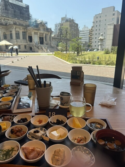 築地本願寺の本堂や境内を眺められる窓際のお席に案内され、優雅な気持ちで身体に優しい朝ごはんで心身共に癒されました。ご馳走様でした!