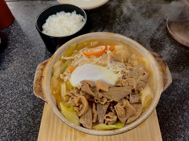 うどんは太くなくやや平たいタイプで、煮込まれていてフワツル。勢いよく啜るとヤケドするので要注意。トロトロネギも富山の赤かまもキュキュするえのきも味が浸みてていい感じ。玉子を崩して黄身のマイルドさも楽しみつつ、うどんを完食。