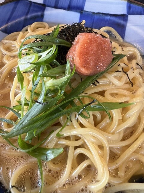約10分程度で配膳。生パスタの独特な艶が美味しさを想像させる。そして色彩のハーモニーも見事だ。パスタ独特の黄色がかったアイボリーの上に広がるネギの鮮やかなグリーンと海苔の黒に明太子のピンクが見事に調和している。見ていて楽しくなってくる。
