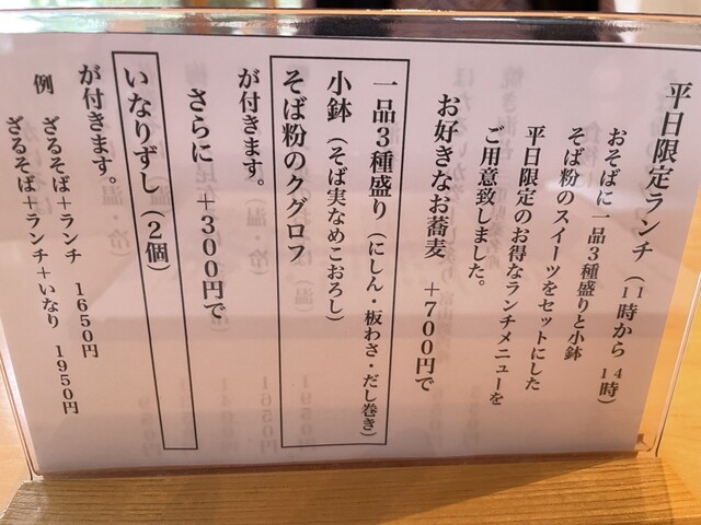 ランチセットにはだし巻き、板わさ、そばの実なめこおろし、そばのクグロフが付いています